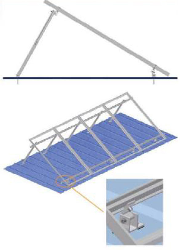 做角度支架安裝類型: 適用于彩鋼瓦,水泥屋頂 A. 結構上,加入了防水墊作為底座的一 部分,來進行防水; B. 防水墊的特點:對雨水進行分流,避 免雨水流入鉆孔處。 產品特點: 1. 現場安裝零件少。產品模塊化設計,零件在工廠已預裝,現場安裝零件只有8個; 2. 安裝工具簡單。標準化程度高,安裝工具簡單、數量少,僅3個; 3. 角度可根據安裝地點改變,通用性強。 產品性能: ●屋頂類型:彩鋼瓦、 瀝青瓦; ●材料:鋁合金6005和不銹鋼304; ●組件類型:邊框或無邊框; ●組件方向:橫放或豎放; ●地貌類型:B,C; ●設計風速:45m/s; ●雪載荷:1.4KN/m2; ●角度調整范圍:10*-15*、15"~30° 、30°-60°。 |